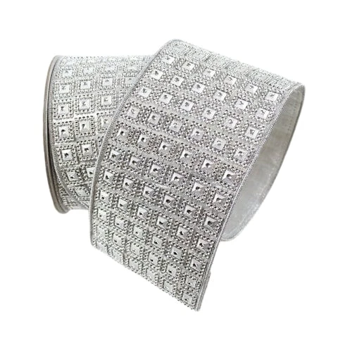 This wired ribbon features shimmering metallic silver fabric in a check pattern, adding a touch of interesting texture to its simple design. Set into the pattern are large silver studs framed by smaller silver studs creating sparkle full of modern style! Sewn wire edged ribbon allows you to bend and shape your creations to decorate with ease, making it perfect for decorating Christmas trees, wreaths, or gift accenting. Made in true designer quality, and crafted from the finest materials, this gorgeous ribbon is sure to bring luxury and contemporary elegance to your holiday decor!
