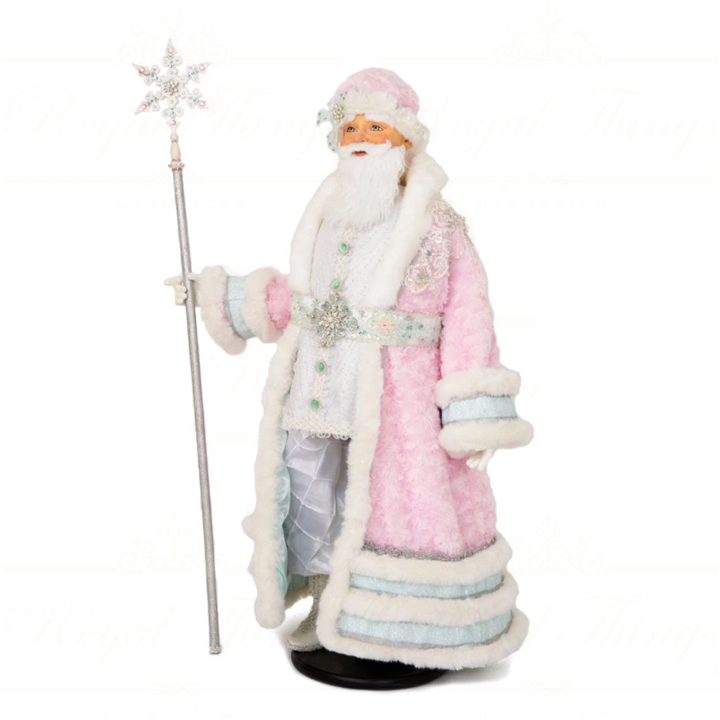 Sir Nicolas Frost Doll measures 24 inches. Handcrafted with amazing detail by skilled artists, this holiday figurine would be the perfect decor on a mantel, shelf, desk, or coffee table. They can be combined with other decorative pieces like snowmen, gnomes, elves, angels, and more. A great collectible figurine to complete your Christmas decoration. The design features a doll dressed in traditional winter attire. The pink hat and coat with blue strips and green gems complete the look.