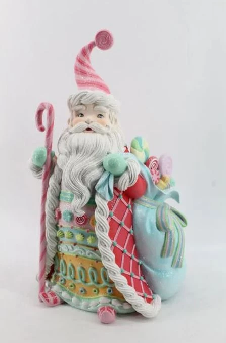 Santa isn’t coming empty handed this year! This pastel sweet Santa is loaded with on bag full of colorful treats! His candy themed outfit and candy cane staff will lead the way to a season full of sweet memories for years to come.