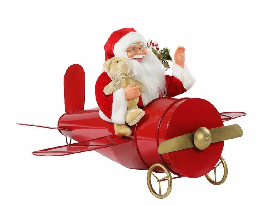 This Santa figure would be a great addition to your holiday decor this year. Santa is delivering presents on a red plane what better way to express those gifts. Santa is wearing his traditional red and white faux fur suit and hat while holding a teddy bear in 1 hand and the other hand is waiving there is a nice pile of gifts right behind Santa for the rest of his trip. You can place this figure in your room’s decor or give away as a present for someone special on your Christmas list. Features. Santa sitting in a plane. Dressed in his traditional red and white faux fur lined suit and hat. He is holding a teddy bear in 1 hand and the other he is waving. There is a large bag of presents behind Santa. Airplane is red with gold accents and a propeller in the front. This plane sits on 3 wheels for stability.