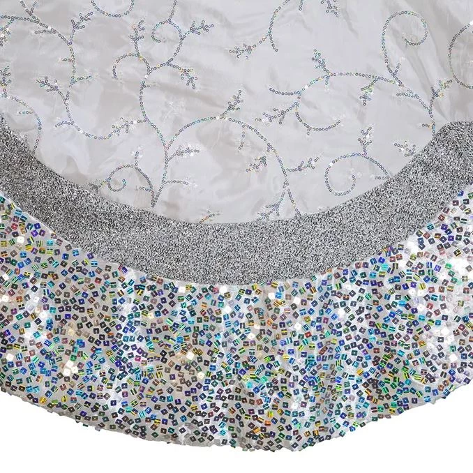 Give your Christmas tree the perfect finishing touch with our silver Sequin Edge tree skirt. It features silver and white satin fabrics in a beautiful scalloped shape. It is finished with lovely details, such as sparkling silver sequins and trim. The luxe fabrics and embellishments create an elegant appearance that is sure at add sophisticated style to your tree!